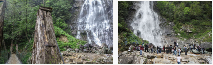 Karagöl ziyaretimiz sonrasında kısa bir öğlen yemeği molasının ardından grup ikiye ayrıldı. Bir grup Artvin’in Sarp Sınır Kapısından Gürcistan’a geçti. Biz Batum’u gördüğümüz için Mençuna Şelalesi turunu tercih ettik. Arhavi’den minibüsle Çifte Kemer Köprüsünden geçerek, Küçük Köye vardık. Yürüyüşün başlayacağı yamaca asma köprüden geçerek vardık. Trekking tadında, patika yoldan, botanik parkı andıran ağaçların arasından tepeye tırmandık. Yaklaşık yarım saat süren ciddi bir tırmanışla nefes nefese zirveye ulaştık. Zirvede şelale kısmına geçmek için iplerden yapılan halat köprüden geçince karşılaştığımız manzara karşısında nutkumuz tutuldu. Yaklaşık 90 metre yüksekten akan şelale tabanda 200 metrekarelik bir gölet oluşturuyor. Muhteşem bir manzara, muhteşem bir doğa harikası. Görüntüyü anlatmak için inanın kelimeler kifayetsiz kalıyor. Mençuna Şelalesi anlatılamaz,yaşanır.