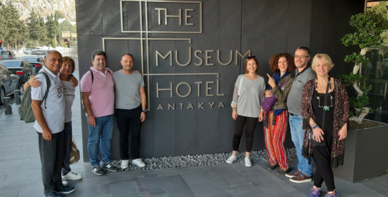 Nihayet heyecanlı bekleyişin sonuna gelmiştik. Hareket günü gelip çatmıştı. Sis uçuşumuzu iki saat etkilemiş olsa da keyfimizi bozmamıştı ama doğal olarak program akışını değiştirmek zorunda kalmıştık. Havaalanı çıkışında bizleri bekleyen araçla önce TheMuseumHotel’e vardık. Hatay’ın ileri gelen ve yatırımcı ailelerinden Asfuroğlu Ailesi şehre otel yapmaya karar vermişler. Temel atma kazıları sırasında zeminde antik mozaiklerle karşılaşınca otelin temeli için başlayan kazıyı durdurup arkeolojik kazıları hızlandırmışlar ve oteli demir konstrüksiyonlar üzerinde mozaiklere zarar vermeyecek şekilde inşa edip bir taşla iki kuş vurarak müze-otel meydana getirmişler. Adına da TheMuseum Hotel demişler.