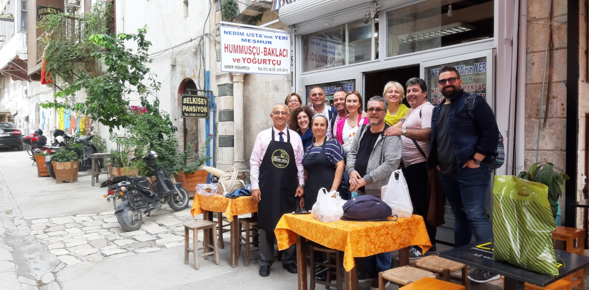 Kahvaltı sonrası tura başlamadan Antakyalı arkadaşımız, “Burada kahvaltı humus ve sıcak bakla ezmesi (Fava gibi) ile yapılır” dedi. Daha yeni kahvaltıdan kalkan bizler için değişik bir deneyim yaşamak için sokak arası humusçularından birine götürdü (Meşhur Humusçu İbrahim Usta). Çok tokuz yiyemeyiz diyen gruba birer tabak hazırlattım. Kasada ödeyinceye kadar tabakta benim için bir tadımlık ancak kalmıştı.