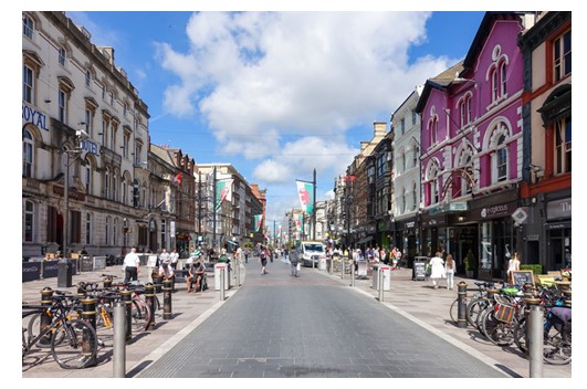 Cardiff’de arabaların girmediği sadece yaya trafiğine açık olan alışveriş caddesi olan Queen Street üzerinde birçok mağaza bulunmaktadır. Queen Street Cardiff’in en önemli caddesidir. Burada alışveriş yapılacak yerler dışında, yemek yenilecek birçok yer de bulunduğu gibi alışveriş merkezleri de yer alıyor. Avrupa’nın en iyi projelerinden biri olarak adlandırılan Cardiff Bay, bir zamanların en işlek rıhtımıyken bugün değişikliğe uğrayarak spor, müzik, gece hayatı ile çok çeşitli etkinliklere ev sahipliği yapan bir kültür merkezine dönüştürülmüş. Gece hayatı ve eğlencenin en popüler ve canlı adresi Cardiff Bay’de bulunan çok sayıda pub, bar ve gece kulübü buranın her zaman kalabalık ve hareketli olmasını sağlarken özellikle cuma ve cumartesi günleri sabahın ilk ışıklarına kadar burada eğlence devam ediyor.