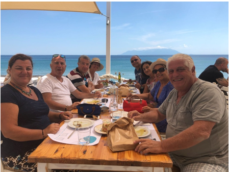 Sözleştiğimiz saatte arkadaşlarla otelin kafesinde buluştuk. Yaptığım keşfi ve akşam yemeği için ayırttığım yeri anlatıp yola koyulduk. Tavernaya vardığımızda müzik başlamıştı bile. Az da olsa Türkçe konuşan şef garsondan masamızın buzuki çalan sanatçıya yakın olmasını istedim. Kırmadı, hemen yanı başında bir masa verdi bize. Cacikis, Grek salat, patlıcan salata gibi klasik mezelerden sipariş verdik. Ara sıcak sonrası ızgara ve tavadan oluşan kocaman bir deniz mahsulleri tabağı geldi. Bizim Yeni Rakı’ya en yakın bulduğumuz mavi etiket Barbayani marka rakı ise Stin İya Su nidaları ve buzukinin nağmeleri ile su gibi aktı. Buzuki eşliğinde şarkılara eşlik edip sirtakiler yaptık 38. evlilik yıldönümümüz çok eğlenip keyif aldığımız bir şölen gibi geçti adeta. Gecenin geç saatinde otele dönmek yerine sahilde bir kahve içtik.
