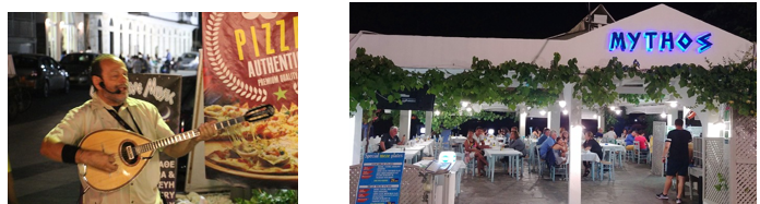 Tüm arkadaşlar odalarına çekilirken ben yeni yerler keşfetmek ve akşam yemeği için uygun bir taverna bulmak amacı ile sahilde dolaşmaya çıktım. Mythos Taverna adlı mekânı uygun görüp akşam için rezervasyon yaptım. Sonrasında otelimizin arkasına bakan çarşıyı keşfe çıktım. Hediyelik eşya satan dükkânlar, plaj ve yazlık kıyafetler satan mağazalar, restoranlar, dondurmacılarla dolu şirin ufak bir çarşı buldum.