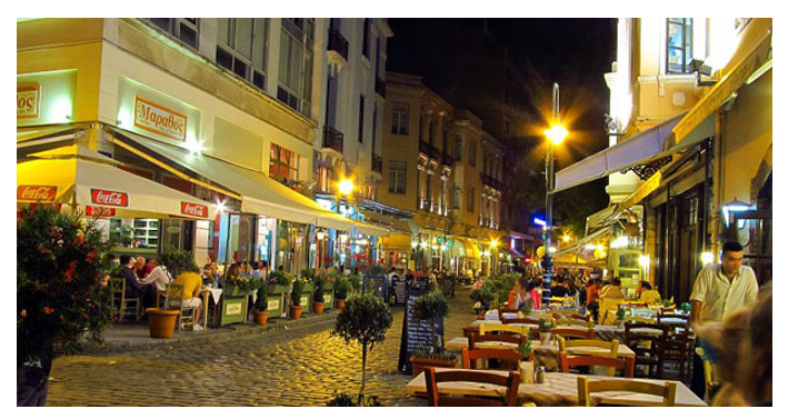 Saat 21.00 de akşam gezimiz için lobide buluştuk. Eski Selanik dedikleri tavernaların, barların bulunduğu böige Ladadika’ya geldik. Öğlen öyle çok ve geç saatte yemek yemiştik ki akşam yiyecek halimiz yoktu. İçki ve meyve eşliğinde buzuki dinleyip sirtaki yapmak istedik. O tarz yerler saat 11 den sonra programa başladığından, beklerken her zamanki gibi bir cafe de oturduk. İlerleyen saatlerde gene tavernaları dolaşıp yer seçmeye çalıştık. Ama yorgunduk ve ortak bir kararla otele döndük.